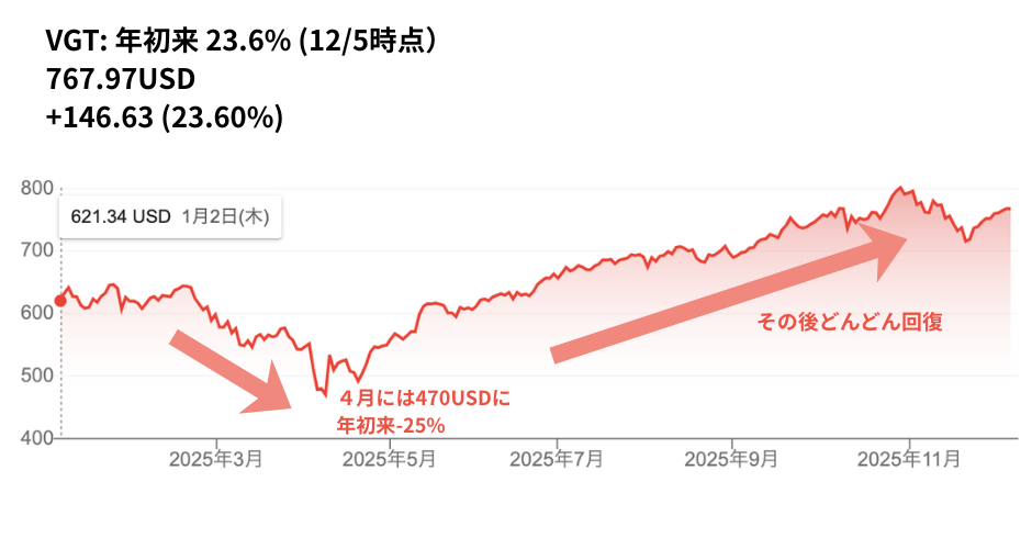 結果的には、2025年年初来のパフォーマンスはVGTの方が良かったのですが、メンタル的にちょっと疲れました。